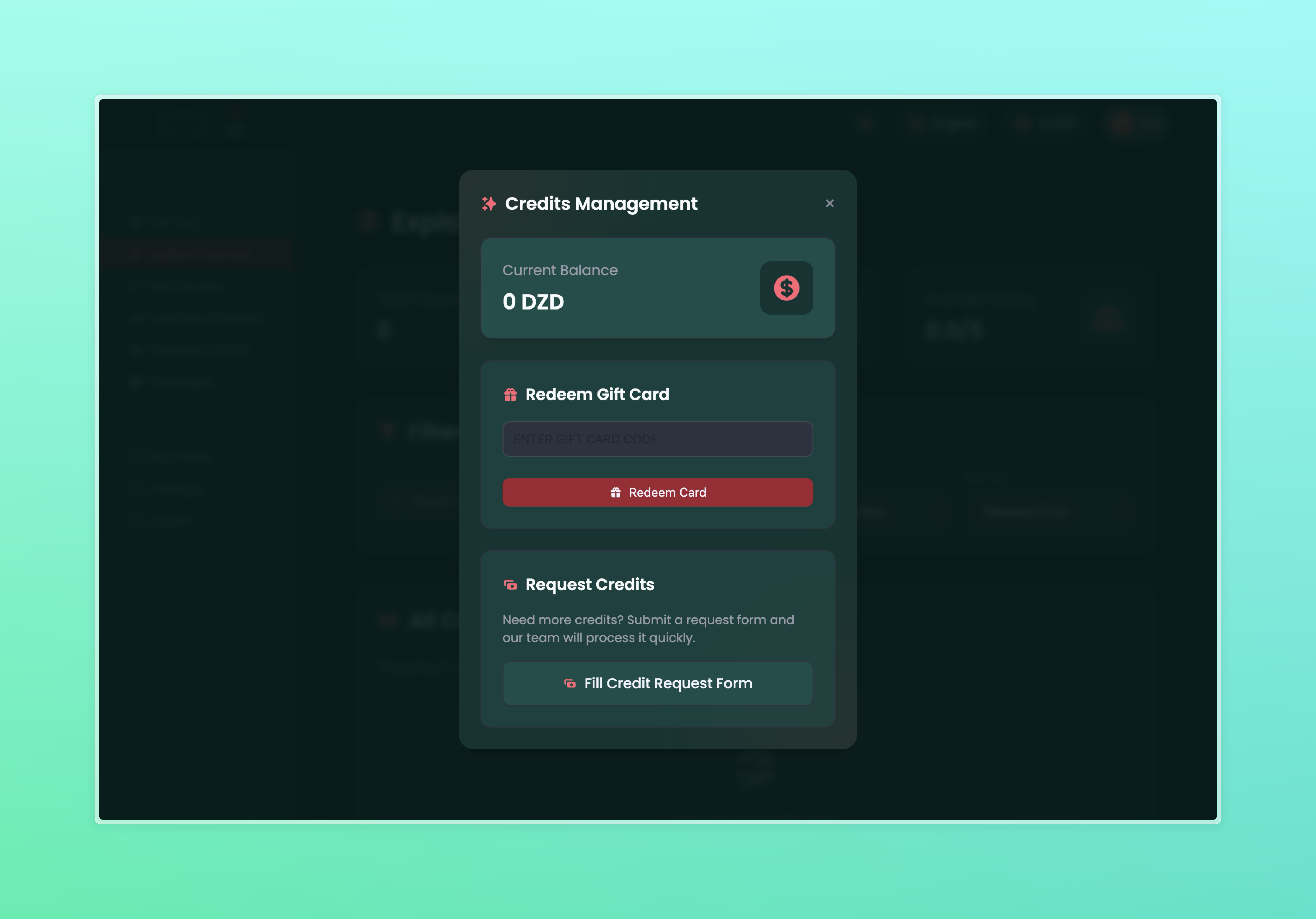 - Credit Requests: Wallet-based system allowing students to request credit top-ups for purchasing content.