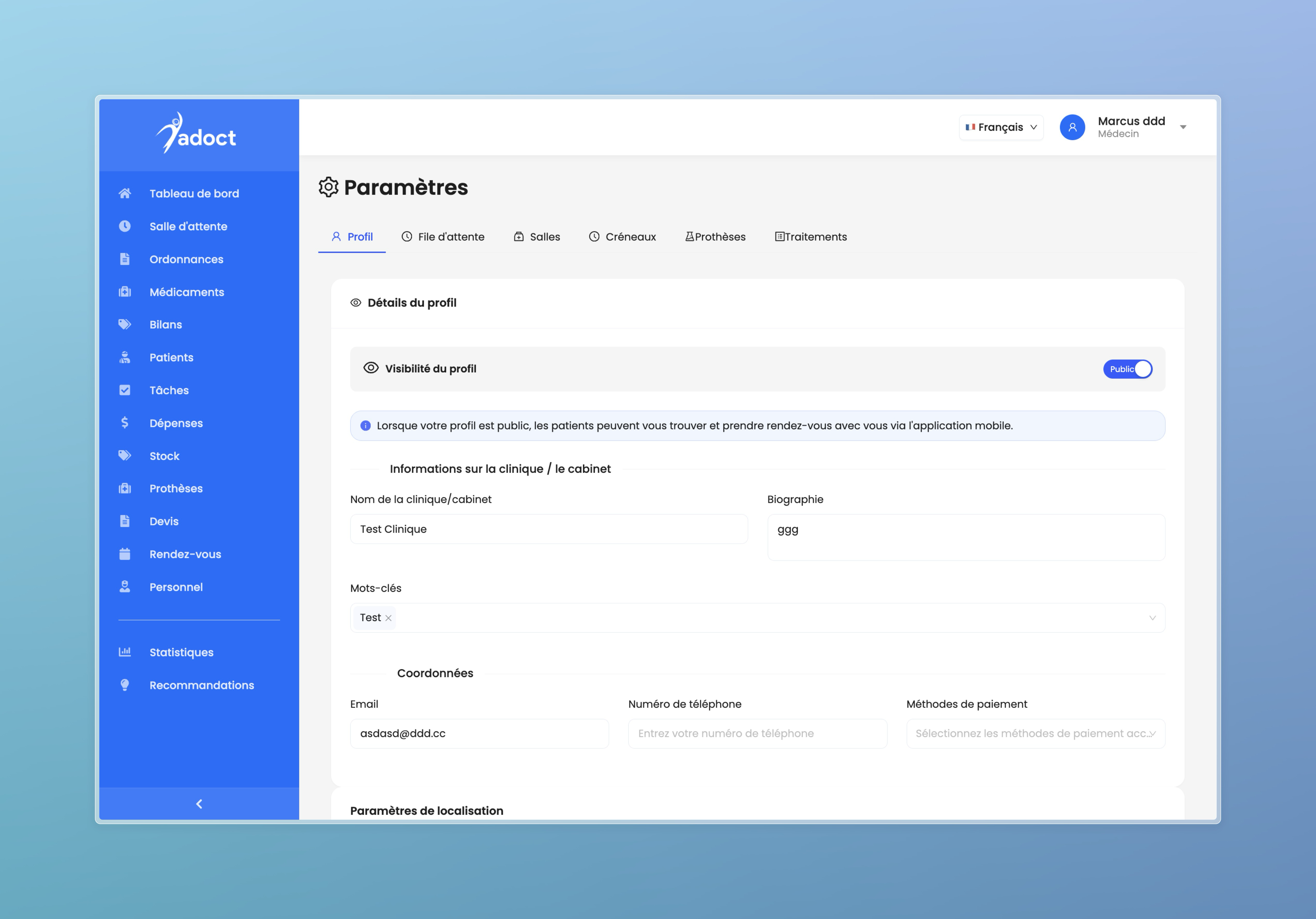 - Financial Suite: Integrated billing, quoting (Devis), expenses tracking, and insurance/prosthetics management.
